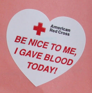After giving blood Sunday, I was tired and even ***gasp*** napped!!! This is another bonus of giving blood. They tell you don't lift anything heavy (groceries, vacuum cleaners, dishes, laundry, etc). Then a sweet lady usually is waiting for you by the snack table. Yes, they WANT and EXPECT you to drink juice or soda and eat cookies and snacks! It's a free pass to eat sweets!!!!! Plus you usually get a cool sticker with complete instructions on how to treat you!